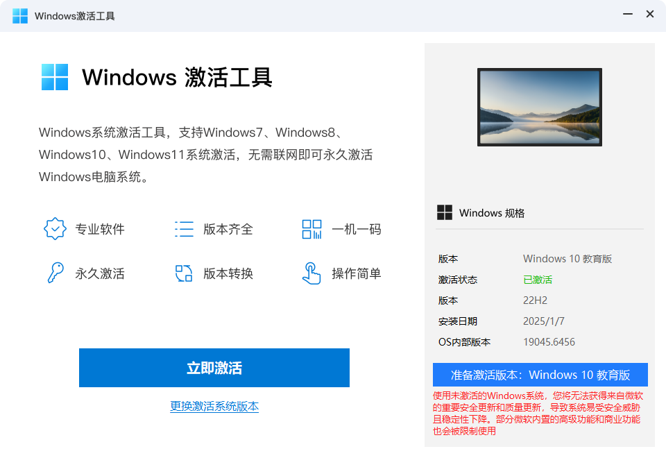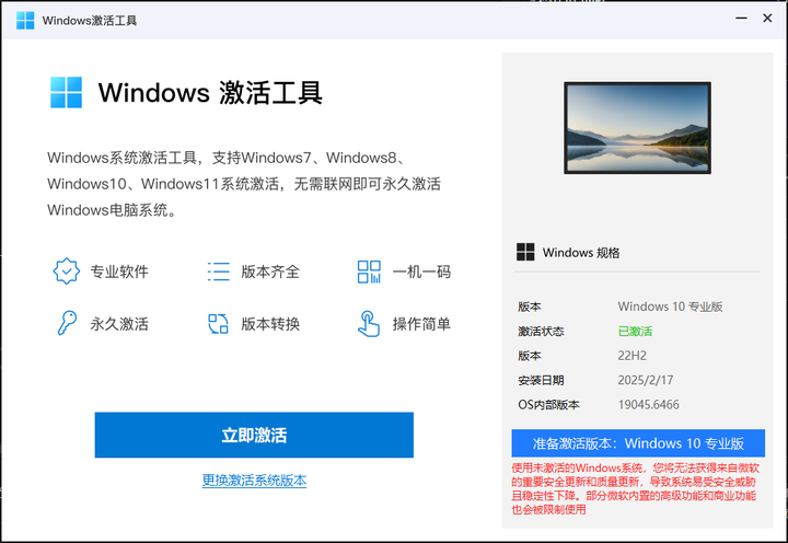 - 支持激活各版本Windows系统,快速安全
